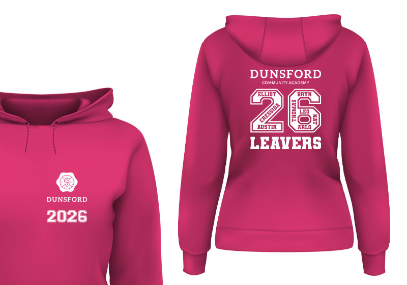 Leaving school is an important step in a child’s life, give them something to remind them of this milestone with a Dunsford Community Academy Leavers Hoodie. Choose from a Kids Hoodie or Varsity Hoodie with the contrast inner hood.
